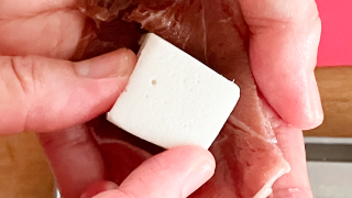 - 肉を広げて、はんぺんを包むようにまるめて、片栗粉をまぶして丸く形を整える。